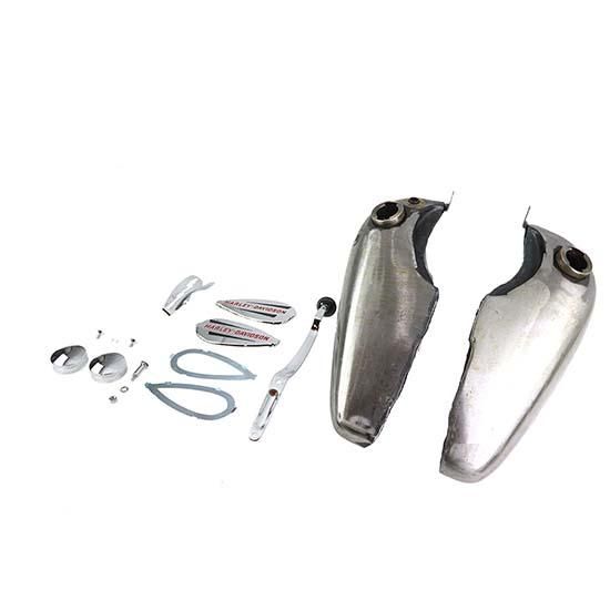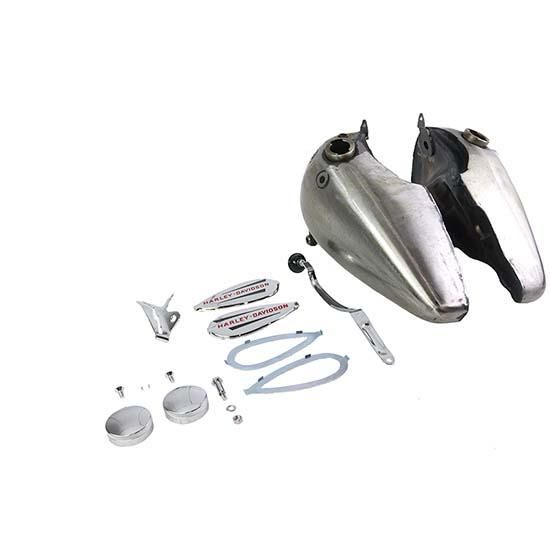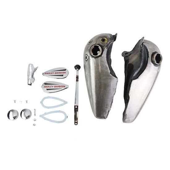 Knucklehead gas tank kit includes a two piece gas tank set with a fuel capacity of 3.5 gallons. Includes an emblem set with red lettering, emblem mounts ,gas cap set, shifter gate and shifter lever.