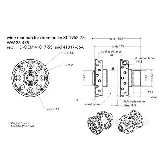 OEM 41017-55 W&W Wide Rear Hub for Drum Brake K/XL 1955-1978 26-435