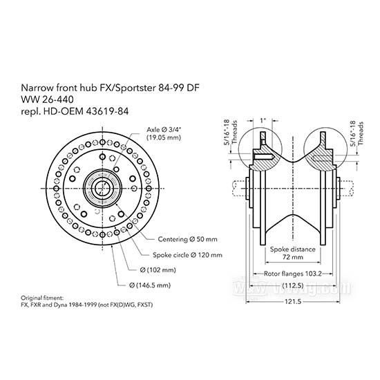 OEM 43619-84 W&W Narrow Dual Flange Front Hub 1984-99-Type 26-440¤Î¥ì¥Ó¥å¡¼
