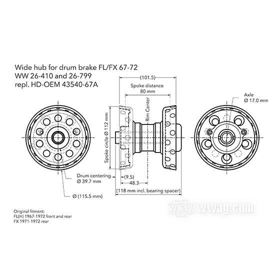OEM 43540-67A W&W Wide Hubs for Drum Brake FL/FX 1967-1972 26-799