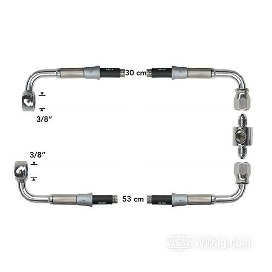 stainless steel / PTFE liner, braided clear coat, two lines with 3/8" 90 banjo, with T connector for brake-light switch