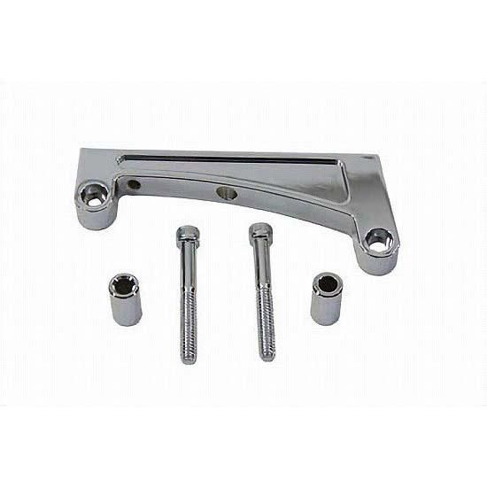 Side mount bracket chrome includes 2 allen screws and 2 spacers. Will mount vertical flat side mount units to FXD primary or softail pivot pin on left side.