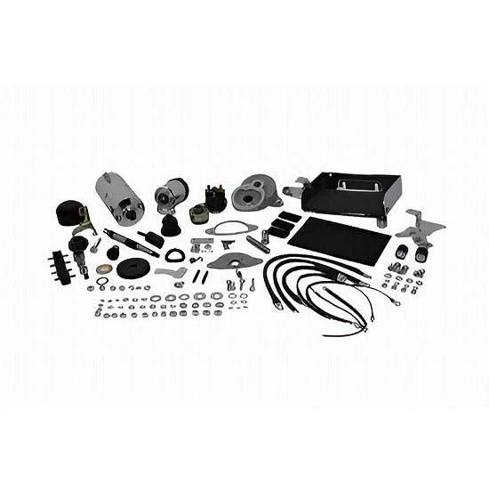 Chrome electric starter kit includes Prestolite starter, bat tery box, solenoid, starter housing, relay, related hardware and brackets.