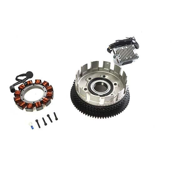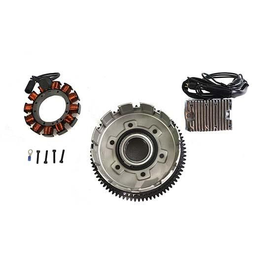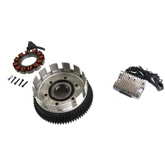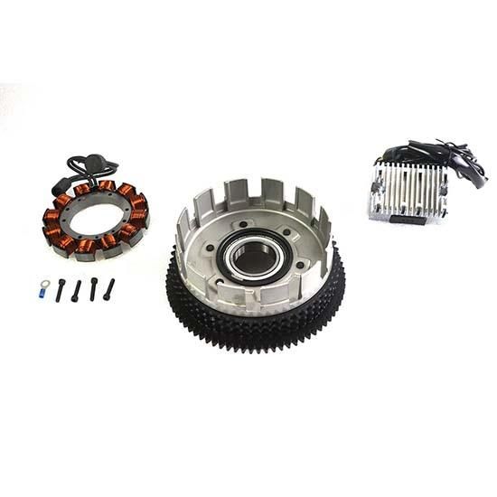 Alternator rotor clutch shell assembly features vibration proof magnet construction, as magnets are held in place by stainless steel non-magnetic insert, stator, and chrome regulator. Charging kit fits XL models with alternator in clutch drum.
