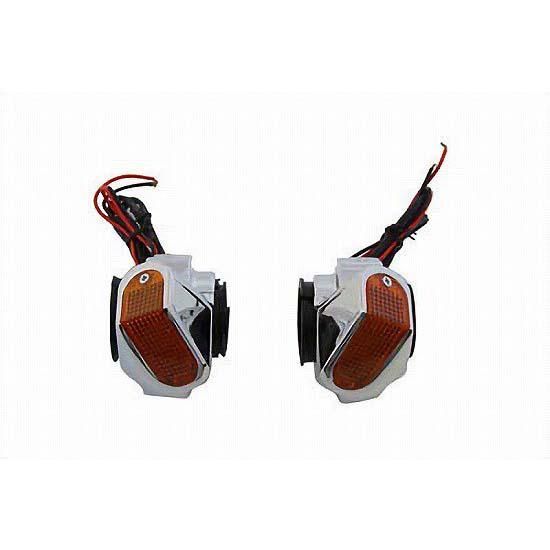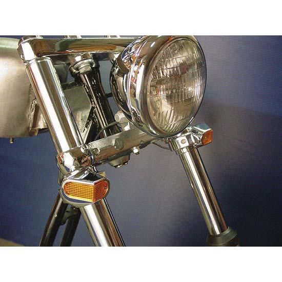 Side panel type fork mount marker lamp set with 12 volt 5 watt clear bulbs with amber wrap around lenses for 35, 39, and 41mm fork tubes.
