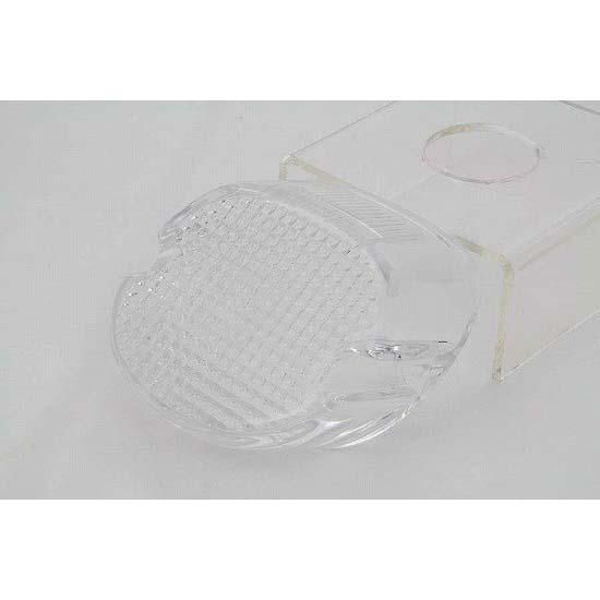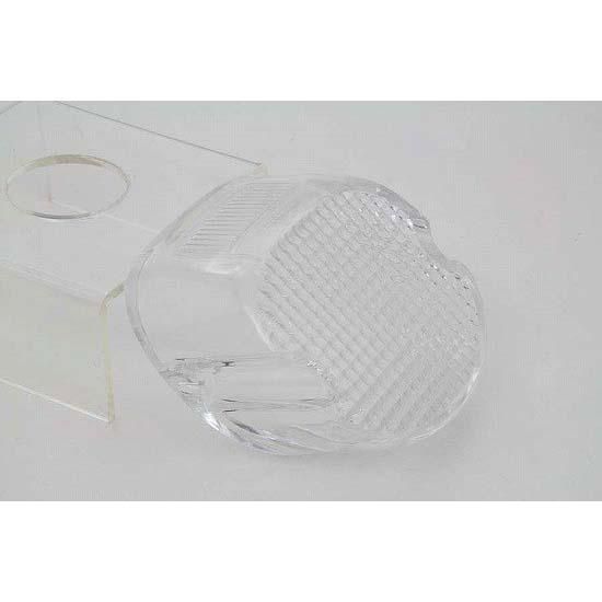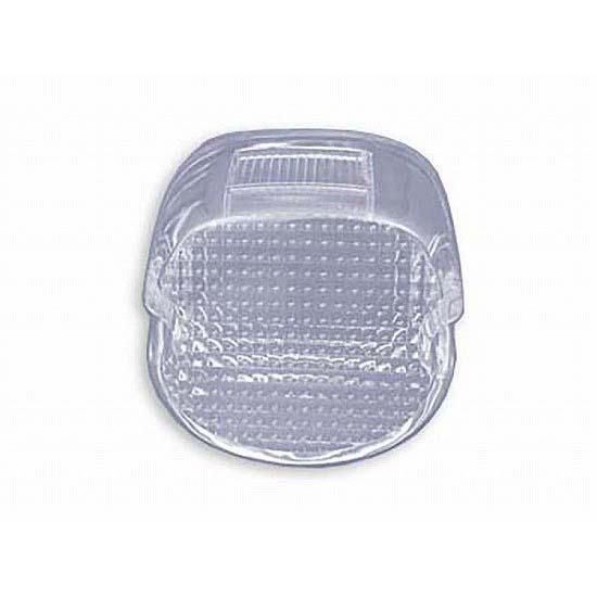 Clear laydown horizontal style tail lamp lens has a license plate lens facing up. Has smooth area for bulb socket.