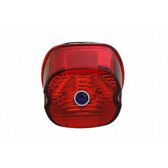 Red laydown horizontal slim style tail lamp lens comes with blue dot and license plate facing down. Has smooth area for bulb socket.
