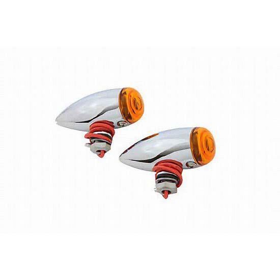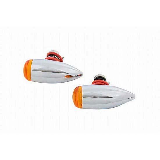 Chrome mini bullet lamp set with 12 volt 10 watt clear bulbs and amber lenses. Includes a single wire.