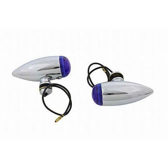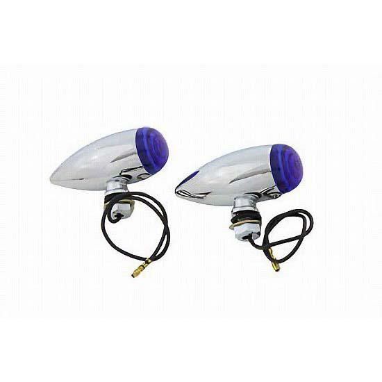 Chrome mini bullet lamp set with 12 volt 10 watt clear bulbs , blue lenses, and a single wire.
