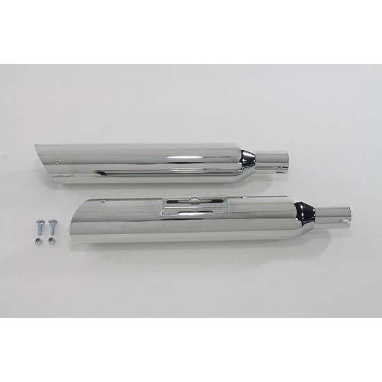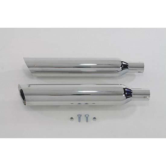 Chrome slip-on muffler set with side slash style ends mounts with 5/16 T bolts which are supplied.