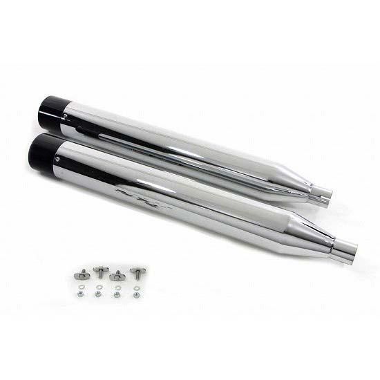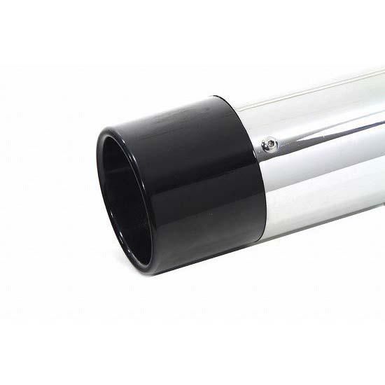 Chrome muffler set features removable black gun barrel style end tips and 4" outer diameter.