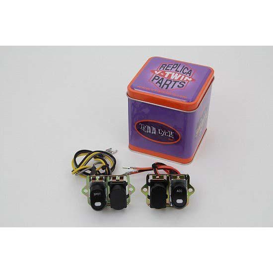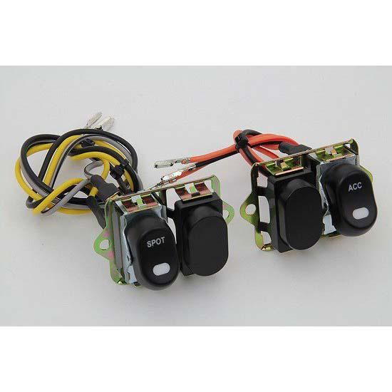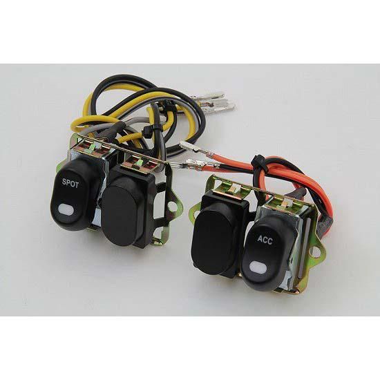 Black fairing handlebar rocker switch with LED indicator. Kit features a four switch configuration which includes only the spotlamp and accessory switch.