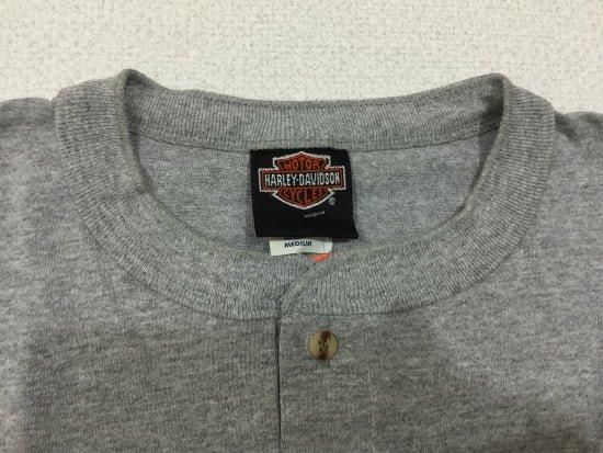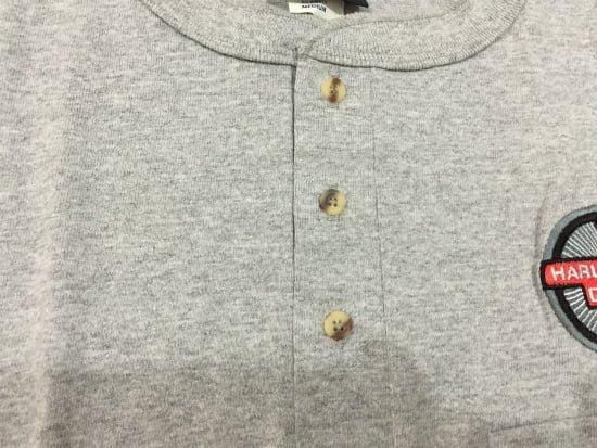 3つボタンの前開きTシャツです。左胸にポケットがついています。その上にはハーレーのタンクエンブレムのような刺繍があります。